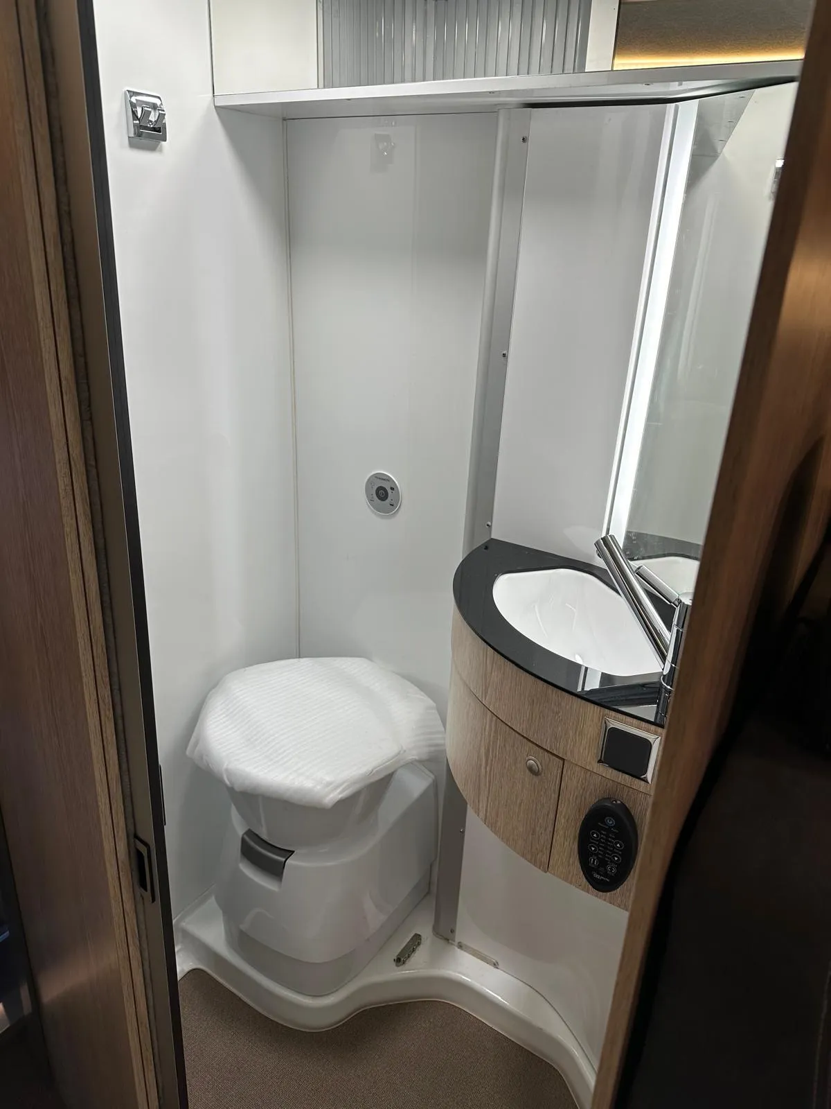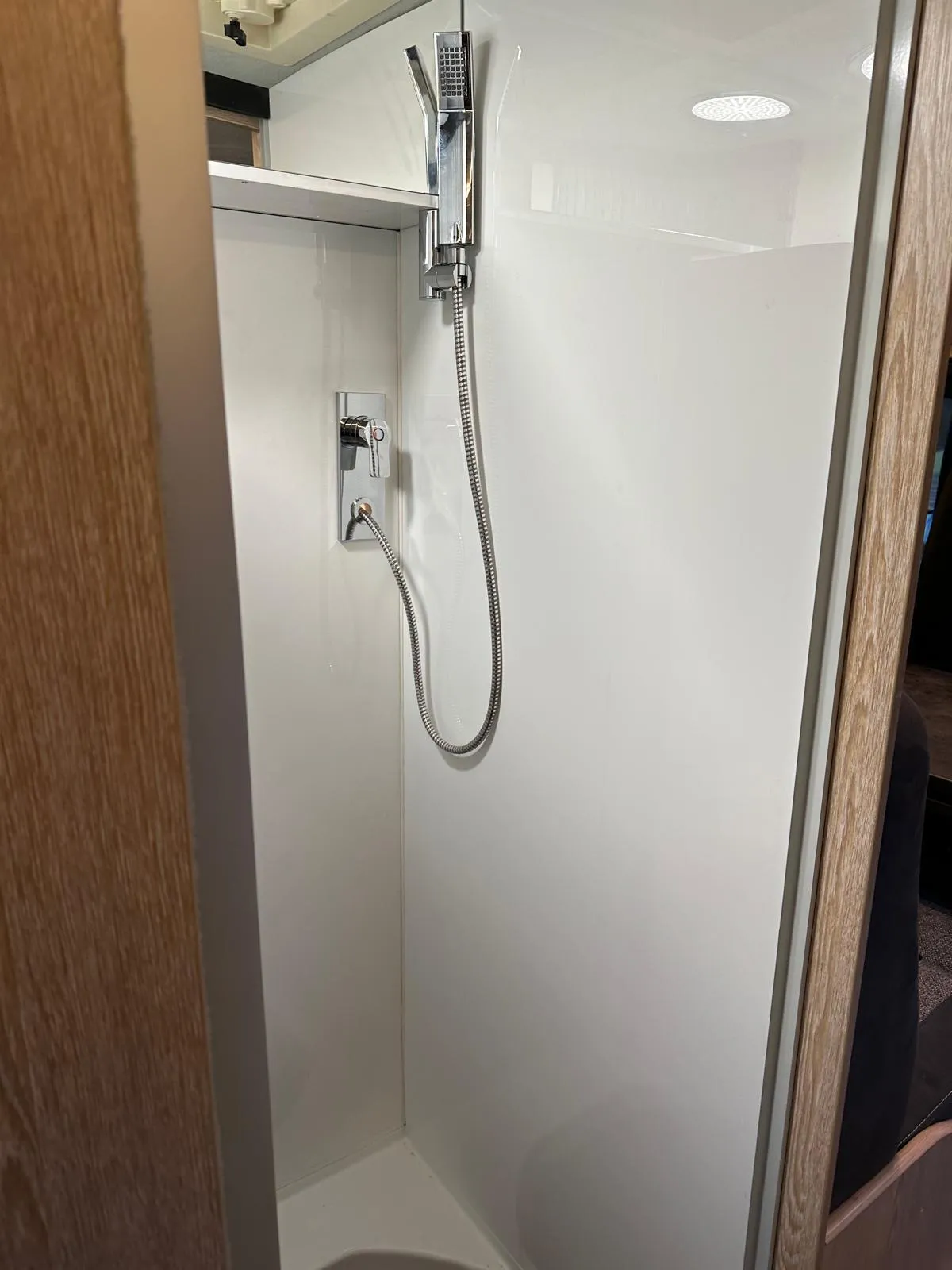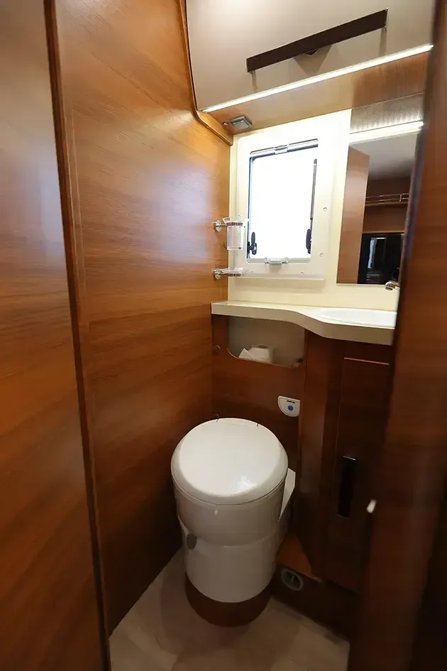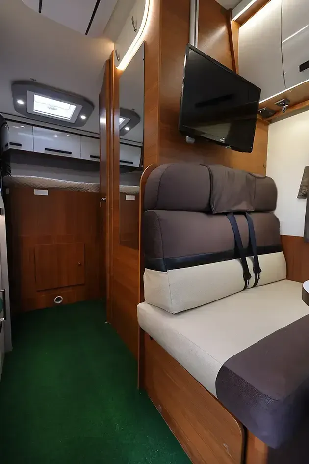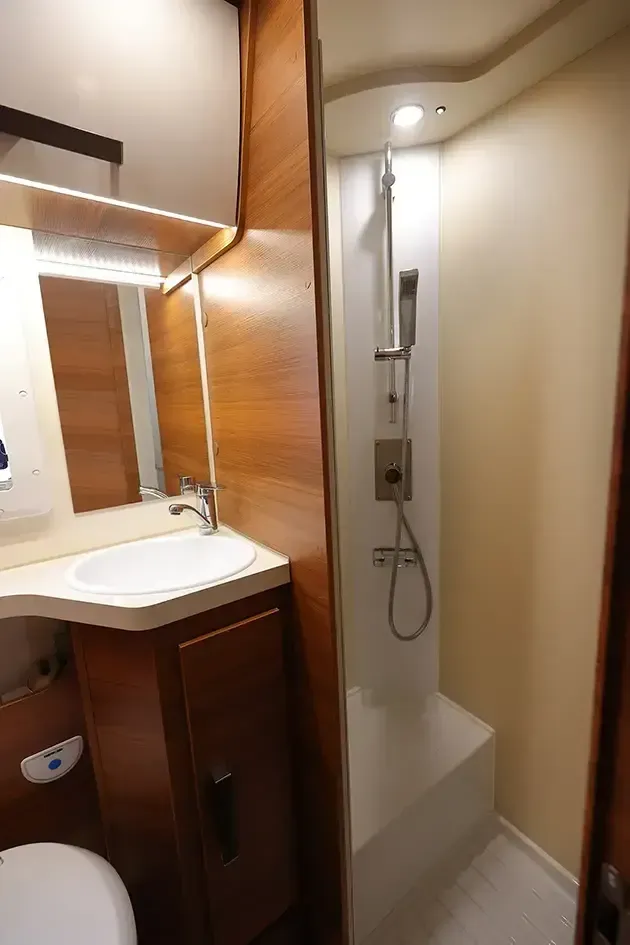 A lakóautó teljes felszereltséggel rendelkezik: modern fürdőszoba zuhanyzóval és WC-vel, jól felszerelt konyha hűtőszekrénnyel, valamint kényelmes hálóhelyek. A beépített klímarendszer gondoskodik a kellemes hőmérsékletről minden évszakban, míg a melegvíz-rendszer biztosítja a komfortos tisztálkodást.